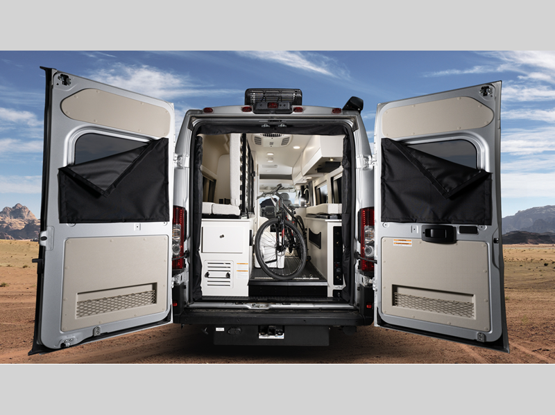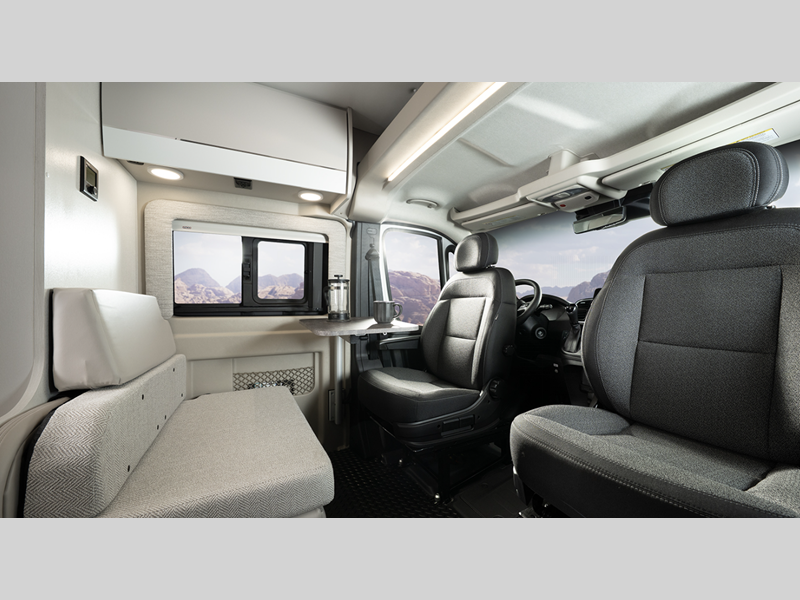 Sleeps 2 Length 20 ft 11 in Ext Width 6 ft 11 in Ext Height 9 ft 3 in Int Height 6 ft 2 in Interior Color Caricou Exterior Color Granite, Silver Hitch Weight 3500 lbs GVWR 9350 lbs Fresh Water Capacity 24 gals Grey Water Capacity 13 gals Black Water Capacity 12 gals Tire Size LT225/75R16E Furnace BTU 20000 btu Generator 2,800-watt Onan Fuel Type Gasoline Engine 3.6L V6 24V VVT Chassis Ram ProMaster 3500 Van Horsepower 276 hp Fuel Capacity 24 gals Wheelbase 159 in Available Beds Two Twin with King Conversion Torque 250 ft-lb Refrigerator Type DC Refrigerator Size 3.1 cu ft Convection Cooking Yes Shower Size 25" x 43" Number of Awnings 1 Water Heater Type Truma Combi Eco Plus AC BTU 13500 btu Awning Info 13' Thule Armless w/LED Light Strip Gross Combined Weight 12000 lbs Shower Type Wet/Bath Shower Electrical Service 30 amp Similar Floorplans